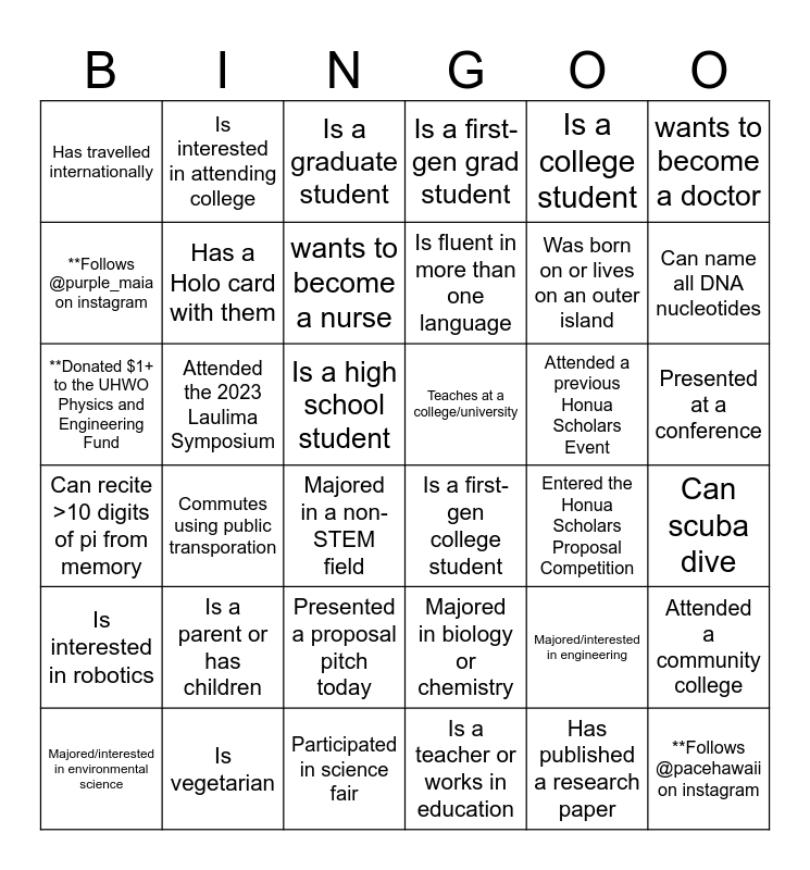 This bingo card has 44 words: **Donated $1+ to Honua Scholars, **Donated $1+ to the UHWO Physics and Engineering Fund, **Follows @honuascholars on Instagram, Majored in a non-STEM field, Majored in biology or chemistry, Can scuba dive, Is a graduate student, Is a middle school student, Is a college student, Is a first-gen college student, Is a first-gen grad student, Attended the 2023 Laulima Symposium, Presented at a conference, Attended a previous Honua Scholars Event, Participated in science fair, Entered the Honua Scholars Proposal Competition, Attended a community college, Was born on or lives on an outer island, Is a middle or high school teacher, Is fluent in more than one language, Is interested in attending college, Majored/interested in environmental science, Majored/interested in engineering, Has travelled internationally, Works or volunteers for a non-profit, Is a high school student, Is a parent or has children, Can program in python, swift, or arduino, Can recite >10 digits of pi from memory, Teaches at a college/university, Has a PhD or MD, Commutes using public transporation, Is vegetarian, Is a teacher or works in education, Can name all DNA nucleotides, Presented a proposal pitch today, Has published a research paper, Is interested in robotics, Has a Holo card with them, wants to become a doctor, wants to become a nurse, **Follows @pacehawaii on instagram, **Follows @purple_maia on instagram and **Follows @hawaiipeoplesfund on instagram.