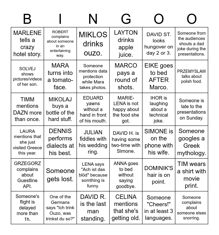 This bingo card has 36 words: ANNA goes to bed without saying goodbye., LENA says "Ach ist das blöd" because somthing is funny., CELINA mentions that she's getting old., SOLVEJ shows pictures/videos of her son., LAURA mentions that she just visited Greece this year., MARIE-LENA is not happy about the food she got., MARA turns into a tomato-face., DAVID R. is the last man standing., DAVID ST. looks hungover on day 2 or 3., DOMINIK'S hair is on point., PRZEMYSLAW talks about polish food., LAYTON drinks apple juice., TIM wears a shirt with movie print., MIKOLAJ buys a bottle of the hard stuff., MARCO pays a round of shots., MARLENE tells a crazy hotel story., GRZEGORZ complains about Guestline API., IHOR is laughing about a technical joke., TIMM mentions DAZN more than once., MIKLOS drinks ouzo., EDUARD yawns without a hand in front of his mouth., DENNIS performs dialects at his best., DAVID H. is having some two-time with Simone., JULIAN fiddles with his wedding ring., SIMONE is on the phone with his wife., ROBERT complains about someone in an entertaining way., EIKE goes to bed AFTER Marco., One of the Germans says "Ich trink Ouzo, was trinkst du so?", Someone mentions data protection while Mara takes photos., Someone from the audiences shouts a dad joke during the presentations., Someone complains about someone elses snorring., Someone's flight is delayed more than 1h., Someone googles a Greek mythology., Someone is late to the presentations on Sunday., Someone gets lost. and Someone "Cheers!" in at least 3 languages..