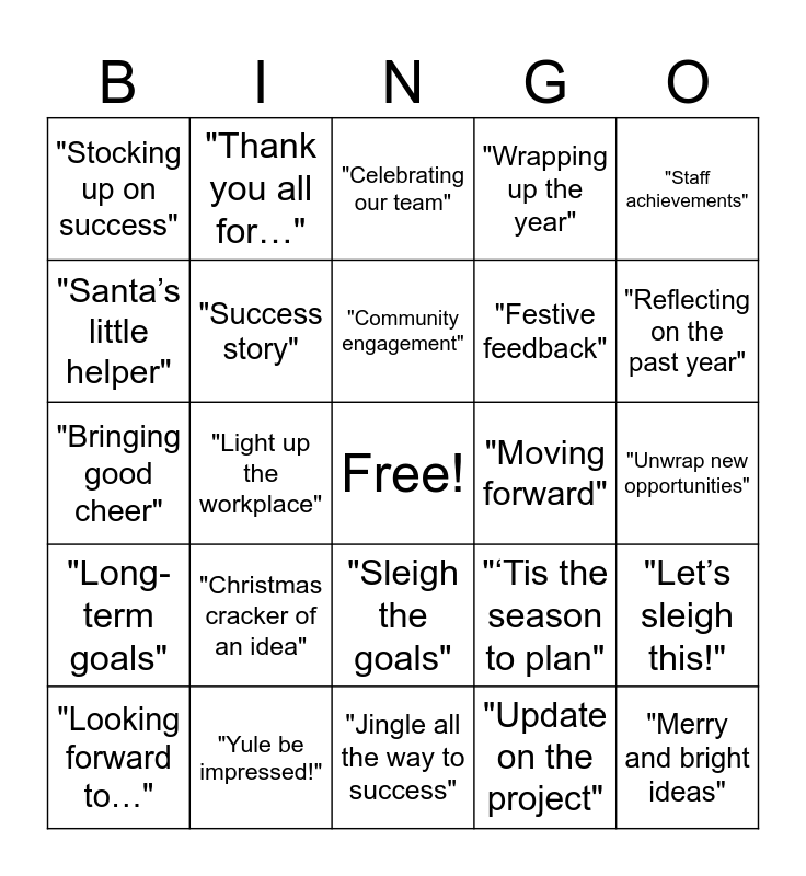 This bingo card has a free space and 34 words: Strategic approach", "Update on the project", "Supporting the community", "Collaboration and teamwork", "Long-term goals", "Success story", "Staff achievements", "Looking forward to…", "Thank you all for…", "Open to feedback", "Community engagement", "Celebrating our team", "Budget planning", "Growth and development", "Moving forward", "Reflecting on the past year", "Yule be impressed!", "Bringing good cheer", "Christmas cracker of an idea", "‘Tis the season to plan", "Sleigh the goals", "Making spirits bright", "Stocking up on success", "Unwrap new opportunities", "Jingle all the way to success", "Merry and bright ideas", "Wrapping up the year", "Oh what fun it is to work here", "Festive feedback", "Santa’s little helper", "Gifting new goals", "Light up the workplace", "Let’s sleigh this!" and "A year in review".