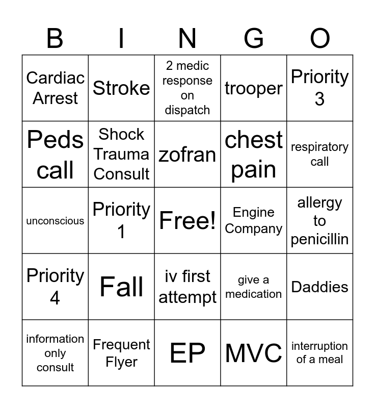 This bingo card has a free space and 25 words: Priority 4, Frequent Flyer, EP, MVC, Priority 3, Cardiac Arrest, Stroke, 2 medic response on dispatch, Engine Company, Daddies, Peds call, Shock Trauma Consult, Police request medical, give a medication, respiratory call, information only consult, Priority 1, zofran, chest pain, allergy to penicillin, unconscious, Fall, iv first attempt, trooper and interruption of a meal.