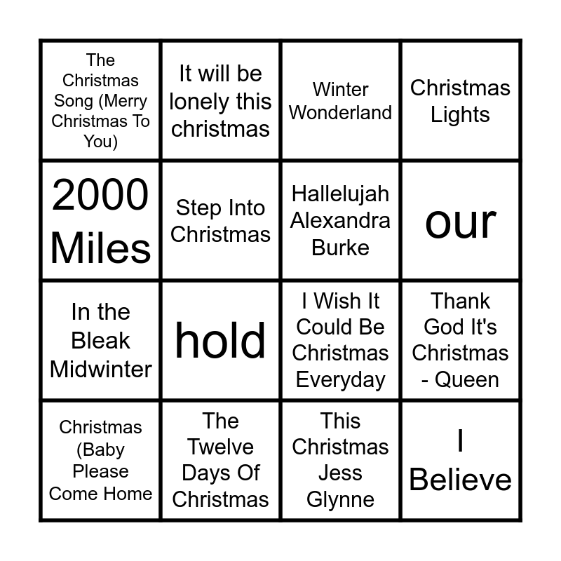 This bingo card has 96 words: now, who, would, her, she, hear, away, come, why, how, what, said, call, hold, many, our, 2000 Miles, A Spaceman Came Travelling, A Winter's Tale, All Alone On Christmas, All I Want For Christmas Is You, Amazing Grace, Auld Lang Syne, Blue Christmas, Christmas (Baby Please Come Home, Christmas Alphabet, Christmas Is All Around, Christmas Lights, Do They Know It's Christmas, Do You Hear What I Hear, Driving Home For Christmas, Fairytale Of New York, Frosty The Snowman, Grandma Got Run Over By A Reindeer, Hallelujah Alexandra Burke, Happy New Year, Happy Xmas (War Is Over)John & Yoko, Holly Jolly ChristmasMichael Bubl‚, I Believe In Father Christmas, I Believe, I Have A Dream, I Saw Mommy Kissing Santa Claus, I Wish It Could Be Christmas Everyday, I'll Be Home For Christmas, In the Bleak Midwinter, It will be lonely this christmas, It's Beginning to Look a Lot Like Christmas, It's Cold Outside, Jingle Bell Rock Bobby Helms, Last Christmas, Let It Snow! Let It Snow! Let It Snow!, Mary's Boy Child, Merry Christmas Ed Sheeran & Elton John, Merry Christmas Everybody, Merry Christmas Darling, Merry Xmas Everybody -Slade, Mistletoe and wine, Mr Blobby, O Holy Night, O Little Town of Bethlehem, One More Sleep Leona Lewis, Only You, Over The Rainbow, Perfect Year, Please Come Home for Christmas- Eagles, Rockin' Around The Christmas Tree, Rudolph The RedNosed Reindeer, Santa Claus Is Back In Town, Santa's baby, Sausage Rolls for Everyone - LadBaby, Saviours day, Silent Night, Silver Bells, Sleigh Ride, Someday At Christmas, Somewhere Only We Know Lily Allen, Stay Another Day, Step Into Christmas, Stop The Cavalry Jona Lewie, Thank God It's Christmas - Queen, The Christmas Song (Merry Christmas To You), The Little Boy That Santa Claus Forgot, The Millennium Prayer, The Most Wonderful Time Of The Year, The Power of Love - Gabrielle Aplin, The Twelve Days Of Christmas, This Christmas Jess Glynne, Underneath the Tree Kelly Clarkson, Walking In The Air, We Three Kings Dolly Parton, We Wish You A Merry Christmas, When A Child Is Born, When You Wish Upon A Star, White Christmas, Winter Wonderland and Wombling Merry Christmas Wombles.