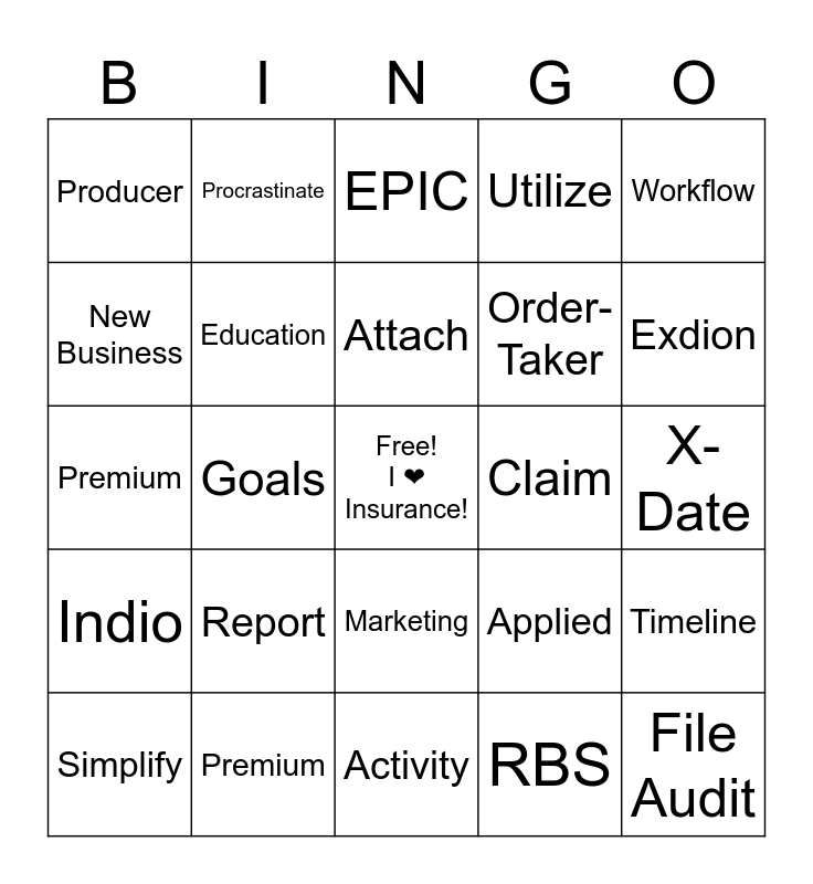 This bingo card has a free space and 29 words: Simplify, Proactive, Goals, Co-insurance, Producer, EPIC, Education, Report, Claim, Premium, X-Date, File Audit, Activity, RBS, Exdion, Top 5, Marketing, Indio, Workflow, Premium, Applied, Reactive, Order-Taker, New Business, Utilize, Procrastinate, Timeline, Attach and Video.