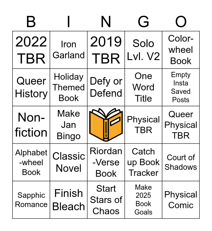 This bingo card has a free space and 29 words: Sapphic Romance, Finish a Series, Make Jan Bingo, 2021 TBR, 2022 TBR, 2019 TBR, Holiday Themed Book, Classic Novel, Physical TBR, Finish Bleach, Queer Physical TBR, Physical Comic, Start Stars of Chaos, Make 2025 Book Goals, Empty Insta Saved Posts, Marvel Comic, Riordan -Verse Book, Alphabet -wheel Book, Color- wheel Book, Non-fiction, Catch up Book Tracker, Audiobook <4hrs, One Word Title, Queer History, Solo Lvl. V2, Iron Garland, Court of Shadows, Defy or Defend and The Neil Gaiman Lib. V1.