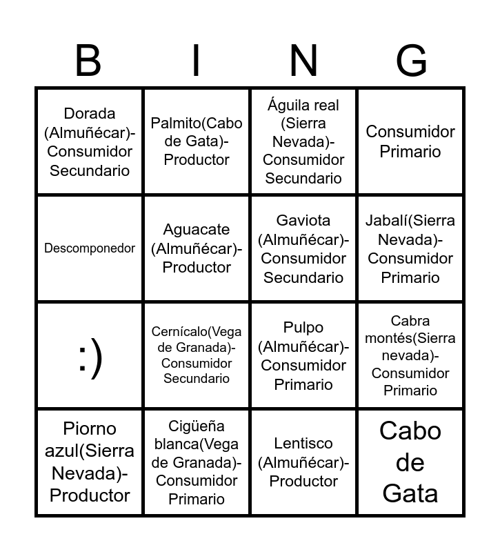This bingo card has 20 words: Cabra montés(Sierra nevada)-Consumidor Primario, Consumidor Primario, Águila real (Sierra Nevada)-Consumidor Secundario, Zorro(Sierra Nevada)-Consumidor Secundario, Piorno azul(Sierra Nevada)-Productor, Descomponedor, Cigüeña blanca(Vega de Granada)-Consumidor Primario, Dorada (Almuñécar)-Consumidor Secundario, :), Palmito(Cabo de Gata)-Productor, Cernícalo(Vega de Granada)-Consumidor Secundario, Pulpo (Almuñécar)-Consumidor Primario, Aguacate (Almuñécar)-Productor, Cabo de Gata, Gaviota (Almuñécar)-Consumidor Secundario, Sabina rastrera(Sierra Nevada)-Productor, Jabalí(Sierra Nevada)-Consumidor Primario, Consumidor Primario, Lentisco (Almuñécar)-Productor and Flamenco (Cabo de Gata)-Consumidor Primario.