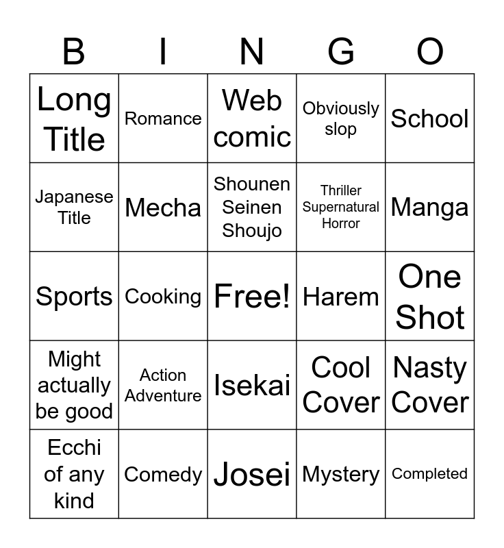 This bingo card has a free space and 24 words: Action Adventure, Comedy, Shounen Seinen Shoujo, Ecchi of any kind, School, Long Title, Japanese Title, Romance, Harem, Isekai, Thriller Supernatural Horror, Sports, Cool Cover, Nasty Cover, Mecha, Mystery, One Shot, Web comic, Manga, Cooking, Completed, Might actually be good, Obviously slop and Josei.