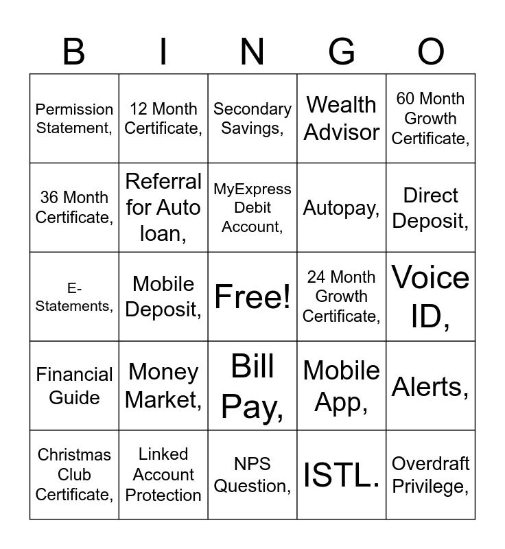 This bingo card has a free space and 25 words: Money Market,, NPS Question,, MyExpress Debit Account,, Christmas Club Certificate,, 60 Month Growth Certificate,, Permission Statement,, 36 Month Certificate,, 12 Month Certificate,, 24 Month Growth Certificate,, Bill Pay,, Autopay,, E-Statements,, Mobile App,, Alerts,, Referral for Auto loan,, Code Word,, Voice ID,, Secondary Savings,, Direct Deposit,, Mobile Deposit,, Overdraft Privilege,, Linked Account Protection, Financial Guide, Wealth Advisor and ISTL..