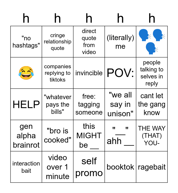 This bingo card has a free space and 27 words: "__" ahh __, yes, POV:, self promo, 😂, direct quote from video, cringe relationship quote, gen alpha brainrot, "we all say in unison", THE WAY (THAT) YOU-, HELP, (literally) me, interaction bait, video over 1 minute, people talking to selves in reply, random verified user comment, companies replying to tiktoks, invincible, "bro is cooked", "no hashtags", cant let the gang know, booktok, "whatever pays the bills", ragebait, this MIGHT be __, 🗣️🗣️🗣️ and 😭🙏.