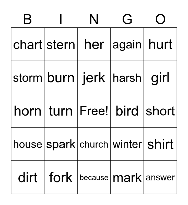 This bingo card has a free space and 24 words: spark, fork, jerk, dirt, hurt, chart, storm, stern, bird, church, harsh, horn, winter, shirt, burn, mark, short, her, girl, turn, answer, house, again and because.