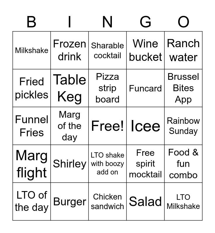 This bingo card has a free space and 29 words: LTO of the day, Big Fun Sunday, Marg of the day, Crowd Pleaser, Milkshake, Sharable cocktail, Table Keg, Shirley, Icee, Burger, Rainbow Sunday, LTO Milkshake, Chicken sandwich, Salad, Brussel Bites App, Smash tacos, LTO shake with boozy add on, Marg flight, Ranch water, Funnel Fries, Free spirit mocktail, Food & Fun combo, Funcard, Fried pickles, Wine bucket, Frozen drink, Food & fun combo, Pizza strip board and Crowd Pleaser.