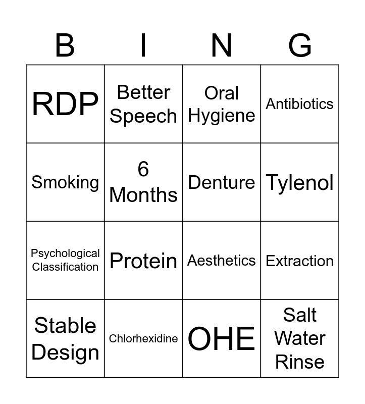 This bingo card has 36 words: Crown, Bridge, Partial, Denture, All-on-Four, Salt Water Rinse, Tylenol, Blood Clot, Smoking, Gauze, Extraction, Antibiotics, Ice Chips, Chlorhexidine, Protein, RDP, Fragility, Diagnostic Evaluation, Stable Design, Oral Hygiene, OHE, Implant, Trauma, Bleeding, Swelling, Better Speech, Aesthetics, Chewing Function, Psychological Classification, 6 Months, Satisfaction, Confidence, Diet, Elderly, Therapy and Quality of life.