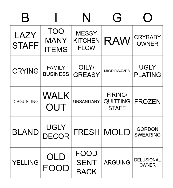 This bingo card has a free space and 24 words: YELLING, UGLY DECOR, OILY/ GREASY, ARGUING, CRYBABY OWNER, LAZY STAFF, TOO MANY ITEMS, MESSY KITCHEN FLOW, FIRING/ QUITTING STAFF, FROZEN, DISGUSTING, FAMILY BUSINESS, MOLD, GORDON SWEARING, CRYING, OLD FOOD, FOOD SENT BACK, RAW, UGLY PLATING, BLAND, WALK OUT, FRESH, MICROWAVES and DELUSIONAL OWNER.