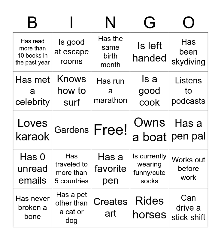 This bingo card has a free space and 24 words: Has traveled to more than 5 countries, Has a pet other than a cat or dog, Has run a marathon, Has never broken a bone, Has been skydiving, Has read more than 10 books in the past year, Has met a celebrity, Is good at escape rooms, Owns a boat, Has a favorite pen, Is a good cook, Loves karaok, Is currently wearing funny/cute socks, Works out before work, Knows how to surf, Rides horses, Has a pen pal, Has the same birth month, Listens to podcasts, Gardens, Can drive a stick shift, Has 0 unread emails, Is left handed and Creates art.