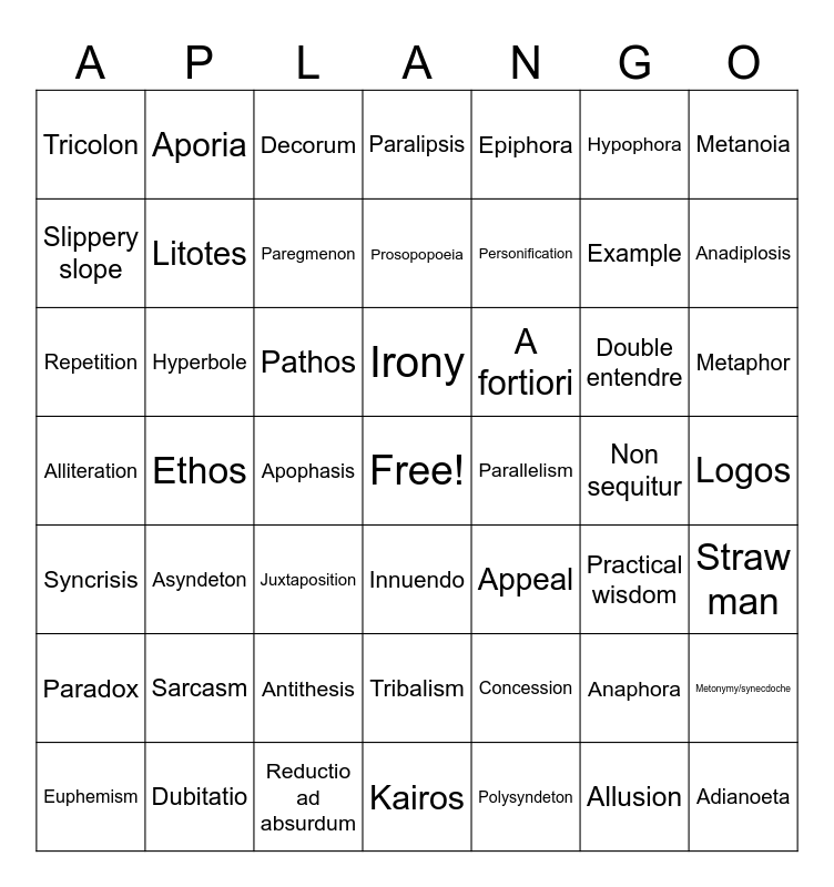 This bingo card has a free space and 48 words: Concession, Example, Kairos, Ethos, Pathos, Logos, Aporia, Dubitatio, Hypophora, Innuendo, Metanoia, Paralipsis, Double entendre, A fortiori, Paradox, Non sequitur, Slippery slope, Anadiplosis, Anaphora, Epiphora, Personification, Apophasis, Tricolon, Litotes, Metonymy/synecdoche, Paregmenon, Metaphor, Euphemism, Irony, Hyperbole, Allusion, Parallelism, Straw man, Sarcasm, Alliteration, Appeal, Practical wisdom, Repetition, Juxtaposition, Antithesis, Syncrisis, Adianoeta, Decorum, Reductio ad absurdum, Prosopopoeia, Tribalism, Asyndeton and Polysyndeton.