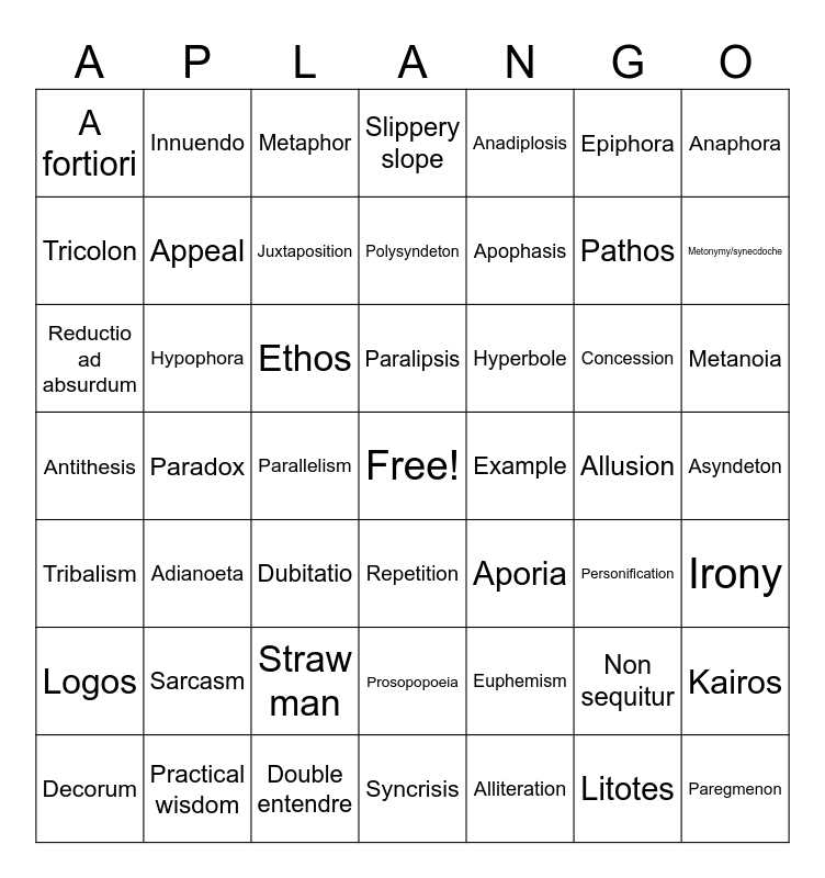 This bingo card has a free space and 48 words: Euphemism, Pathos, Syncrisis, Paradox, Ethos, Asyndeton, Innuendo, Practical wisdom, Epiphora, Repetition, Anaphora, Slippery slope, Concession, Hyperbole, Logos, Allusion, Tricolon, Metonymy/synecdoche, Non sequitur, Anadiplosis, Apophasis, Parallelism, A fortiori, Appeal, Kairos, Juxtaposition, Metanoia, Decorum, Paralipsis, Hypophora, Litotes, Example, Irony, Sarcasm, Antithesis, Aporia, Personification, Reductio ad absurdum, Dubitatio, Straw man, Tribalism, Paregmenon, Metaphor, Double entendre, Polysyndeton, Prosopopoeia, Adianoeta and Alliteration.