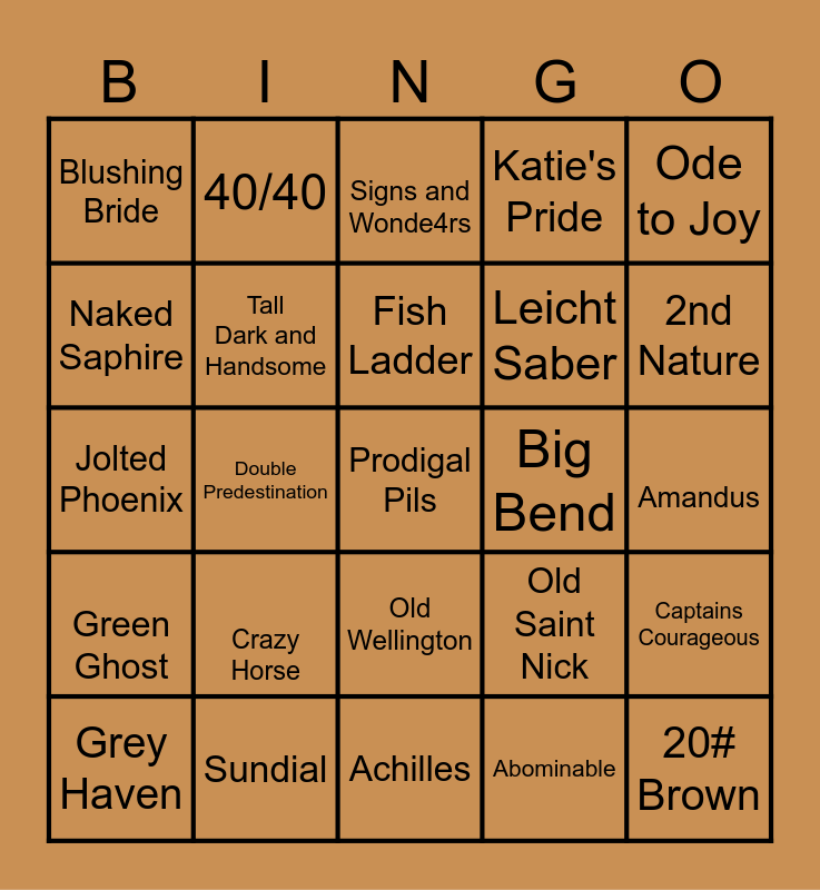 This bingo card has 30 words: Sundial, Dawn Treader, Double Predestination, Lightning Wolf, Blushing Bride, Signs and Wonde4rs, Tall Dark and Handsome, Old Wellington, Big Bend, Achilles, Amandus, Prodigal Pils, Abominable, 20# Brown, 2nd Nature, Shackelton, Old Saint Nick, Green Ghost, Crazy Horse, Ode to Joy, Jolted Phoenix, Good Intentions, 40/40, Leicht Saber, Naked Saphire, Katie's Pride, Captains Courageous, Grey Haven, Fish Ladder and There and Back Again.