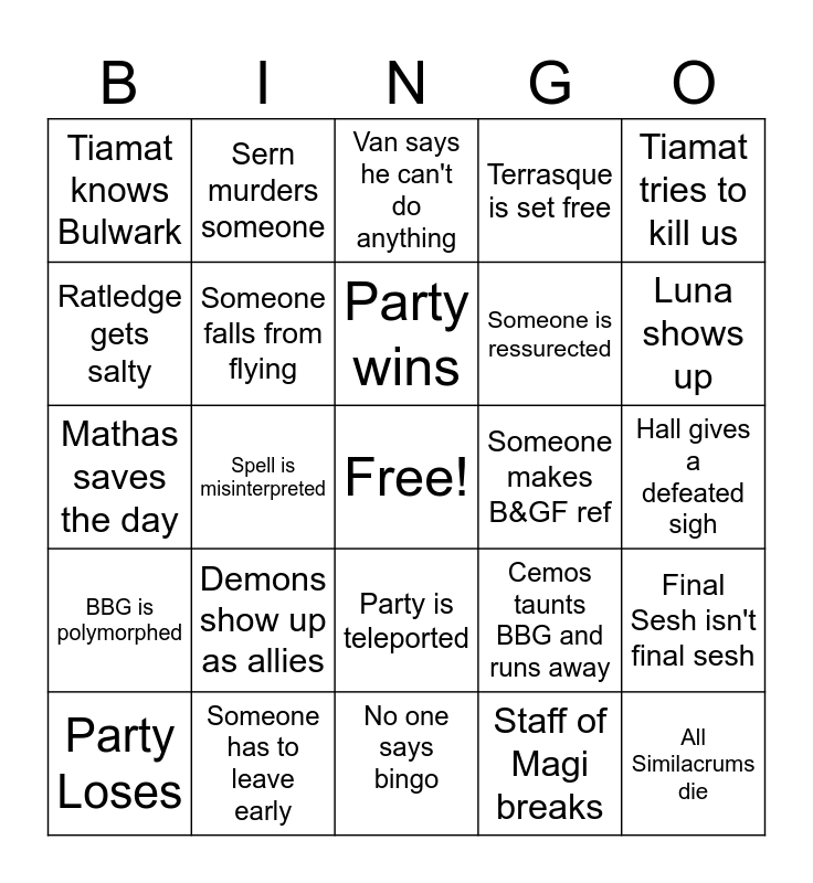 This bingo card has a free space and 24 words: Demons show up as allies, Someone has to leave early, Party wins, Party Loses, Tiamat tries to kill us, Tiamat knows Bulwark, Ratledge gets salty, Sern murders someone, Someone makes B&GF ref, Party is teleported, Someone is ressurected, Mathas saves the day, Cemos taunts BBG and runs away, Final Sesh isn't final sesh, Someone falls from flying, Staff of Magi breaks, Hall gives a defeated sigh, Van says he can't do anything, Luna shows up, Spell is misinterpreted, All Similacrums die, BBG is polymorphed, Terrasque is set free and No one says bingo.