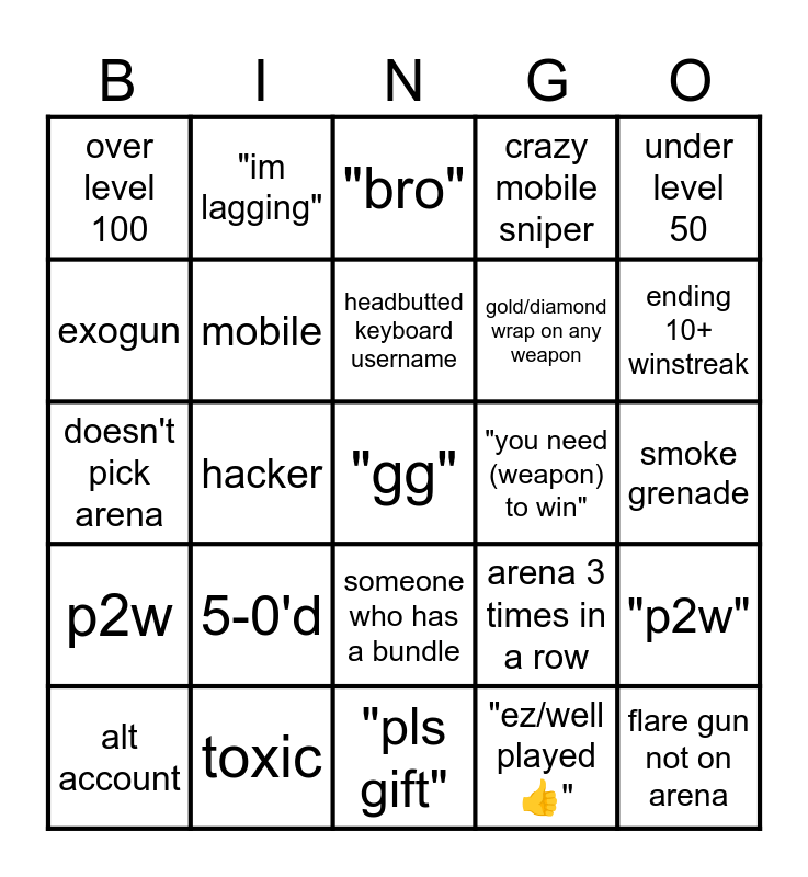 This bingo card has 25 words: p2w, toxic, "gg", "ez/well played👍", under level 50, over level 100, "im lagging", "bro", "you need (weapon) to win", "p2w", exogun, mobile, "pls gift", arena 3 times in a row, ending 10+ winstreak, alt account, hacker, headbutted keyboard username, gold/diamond wrap on any weapon, smoke grenade, doesn't pick arena, 5-0'd, someone who has a bundle, crazy mobile sniper and flare gun not on arena.