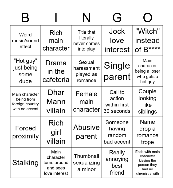 This bingo card has a free space and 24 words: Rich girl villain, Main character turns around and sees love interest, Sexual harassment played as romance, Stalking, "Witch" instead of B****, Weird music/sound effect, "Hot guy" just being some dude, Rich main character, Call to action within first 30 seconds, Abusive parent, Single parent, Main character being from foreign country with no accent, Someone having random bad accent, Name drop a romance trope, Drama in the cafeteria, Really annoying best friend, Couple looking like siblings, Title that literally never comes into play, Main character being a loser who gets a hot guy, Dhar Mann villain, Ends with main character kissing the person they had no chemistry with, Forced proximity, Jock love interest and Thumbnail sexualizing a minor.