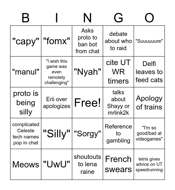 This bingo card has a free space and 24 words: "Silly", "UwU", "Nyah", Meows, "Suuuuuure", "capy", "manul", "fomx", talks about Shayy or mrlink2k, "Sorgy", cite UT WR timers, proto is being silly, Reference to gambling, "I'm so good/bad at videogames", "I wish this game was even remotely challenging", French swears, Apology of trains, Asks proto to ban bot from chat, Delfi leaves to feed cats, Erii over apologizes, tetris gives advice on UT speedrunning, complicated Celeste tech names pop in chat, debate about who to raid and shoutouts to lena raine.