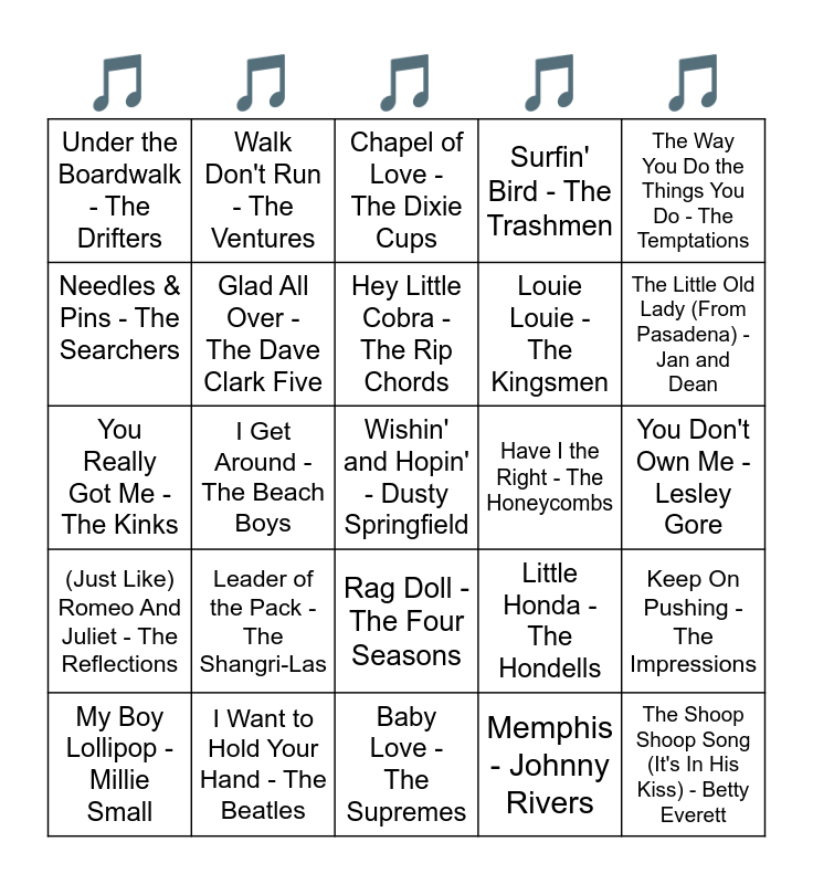 This bingo card has 30 words: I Want to Hold Your Hand - The Beatles, Oh, Pretty Woman - Roy Orbison, I Get Around - The Beach Boys, Do Wah Diddy Diddy - Manfred Mann, Under the Boardwalk - The Drifters, Chapel of Love - The Dixie Cups, Glad All Over - The Dave Clark Five, Rag Doll - The Four Seasons, Have I the Right - The Honeycombs, Baby Love - The Supremes, You Don't Own Me - Lesley Gore, Wishin' and Hopin' - Dusty Springfield, Memphis - Johnny Rivers, The Shoop Shoop Song (It's In His Kiss) - Betty Everett, The Little Old Lady (From Pasadena) - Jan and Dean, Baby I Need Your Loving - The Four Tops, Little Honda - The Hondells, (Just Like) Romeo And Juliet - The Reflections, Leader of the Pack - The Shangri-Las, The Way You Do the Things You Do - The Temptations, You Really Got Me - The Kinks, Dang Me - Roger Miller, Walk Don't Run - The Ventures, Louie Louie - The Kingsmen, Needles & Pins - The Searchers, Surfin' Bird - The Trashmen, Keep On Pushing - The Impressions, My Boy Lollipop - Millie Small, Hey Little Cobra - The Rip Chords and Bread and Butter - The Newbeats.