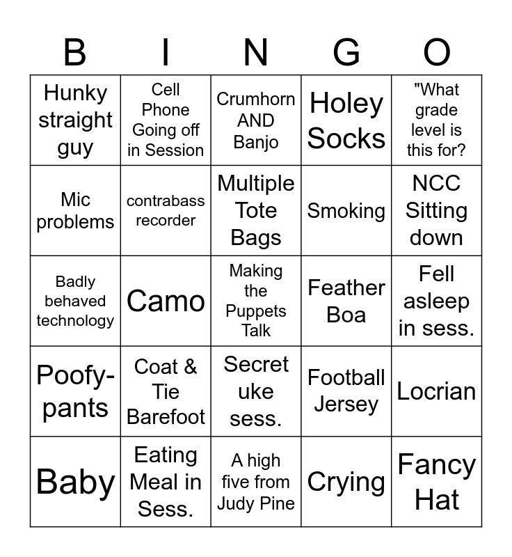 This bingo card has 68 words: Free!, Making the Puppets Talk, Spontaneous Lobby Song/Dance, Disagreement over rhythm syllables, Pre-San Jose Shirt, Sleeve Tattoo, Cell Phone Going off in Session, Recorder Around Neck at Dinner, Multiple Tote Bags, Snoring Roommate, Secret uke sess., Studio 49 Guy, Fell asleep in sess., "What grade level is this for?, "How do you assess that?", Mic problems, Camo, Hunky straight guy, Birks/Crocs & socks, Coat & Tie Barefoot, Smoking, Football Jersey, Poofy-pants, Fancy Hat, Lost/Forgotten Banner, Fire Alarm, Street Song, Ding Dong Diggidiggidong, Locrian, Stepping over Barred Insts., Crumhorn AND Banjo, Toys in a sess., Sneezing/coughing fit, Animal Noises, Holey Socks, Common Core, Banner Parade Dance, Baby, NCC Sitting down, Badly behaved technology, Tuxedo, Country Music, contrabass recorder, Fart in Elevator, Exec. Board member in Jammies, xylophone ringtone, Lecture-only session, Gaggle of College Students, Feather Boa, Eating Meal in Sess., Long hug, ACEMM booth Chocolate, Swear Words in Speech/Sess., A high five from Judy Pine, Birthday song, Canon #91, Crying, Geometric Digression Dance, 20+ in a hotel room, Josh Southard eating a non-potato veggie, Kicked out of local establishment, Spontaneous Gospel Sing, Boomwhackers in sess., 3+ Ribbon Name Badge, Folk Dancing in Stiletto Heels, Music Sweater, Mohawk and Naughty List Song.