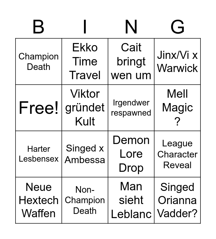 This bingo card has 16 words: Non- Champion Death, League Character Reveal, Cait bringt wen um, Champion Death, Harter Lesbensex, Ekko Time Travel, Demon Lore Drop, Man sieht Leblanc, Free!, Viktor gründet Kult, Neue Hextech Waffen, Jinx/Vi x Warwick, Singed x Ambessa, Mell Magic ?, Irgendwer respawned and Singed Orianna Vadder?.