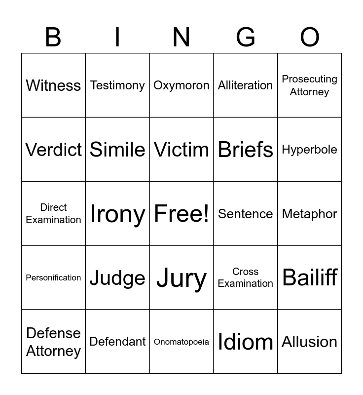 This bingo card has a free space and 24 words: Judge, Defendant, Victim, Defense Attorney, Prosecuting Attorney, Witness, Verdict, Testimony, Sentence, Jury, Briefs, Direct Examination, Cross Examination, Bailiff, Simile, Idiom, Metaphor, Oxymoron, Hyperbole, Irony, Allusion, Personification, Alliteration and Onomatopoeia.