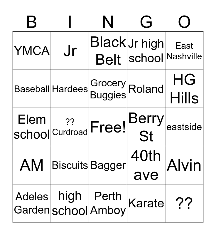 This bingo card has a free space and 28 words: Alvin, Mason, Roland, Karate, Baseball, Black Belt, Jr, AM, Berry St, Adeles Garden, Elem school, Jr high school, high school, Perth Amboy, HG Hills, Kroger, Biscuits, Hardees, Grocery Buggies, Bagger, YMCA, Planet Fitness, ??, ?? Curdroad, eastside, 40th ave, East Nashville and Mt Juliet.