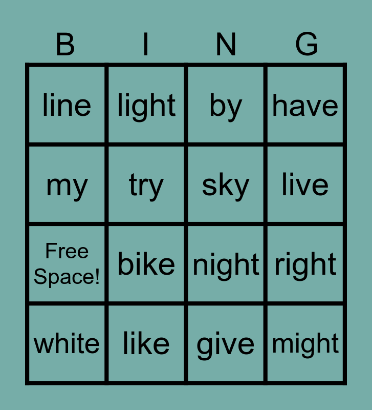 This bingo card has 20 words: right, why, by, nine, white, my, like, line, Free Space!, light, bike, night, try, might, sky, five, live, have, give and reach.