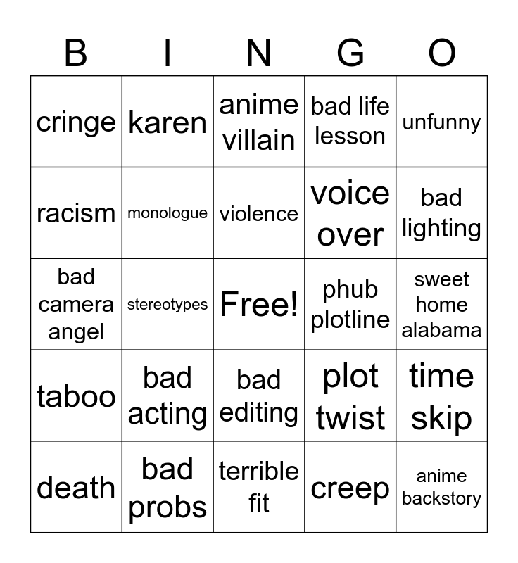 This bingo card has a free space and 24 words: bad acting, bad probs, violence, death, unfunny, cringe, racism, karen, phub plotline, bad editing, voice over, bad camera angel, plot twist, time skip, monologue, creep, sweet home alabama, anime villain, bad lighting, stereotypes, anime backstory, taboo, bad life lesson and terrible fit.