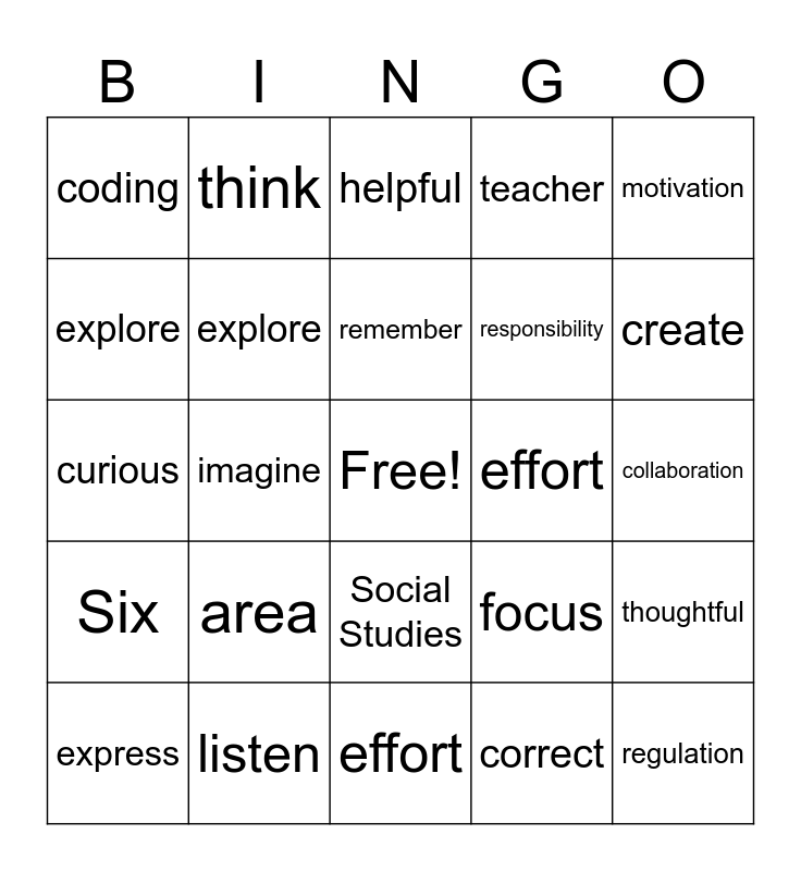 This bingo card has a free space and 54 words: Iroquois, Six, French, Science, Social Studies, Gym, teacher, student, explore, computers, coding, learn, listen, express, patience, effort, regulation, responsibility, initiative, collaboration, focus, concentration, effort, motivation, study, think, read, library, estimate, correct, try, persevere, respect, attention, helpful, reliable, curious, thoughtful, consider, explore, investigate, electricity, angles, perimeter, area, math, technology, understand, remember, imagine, create, artistic, design and imagine.