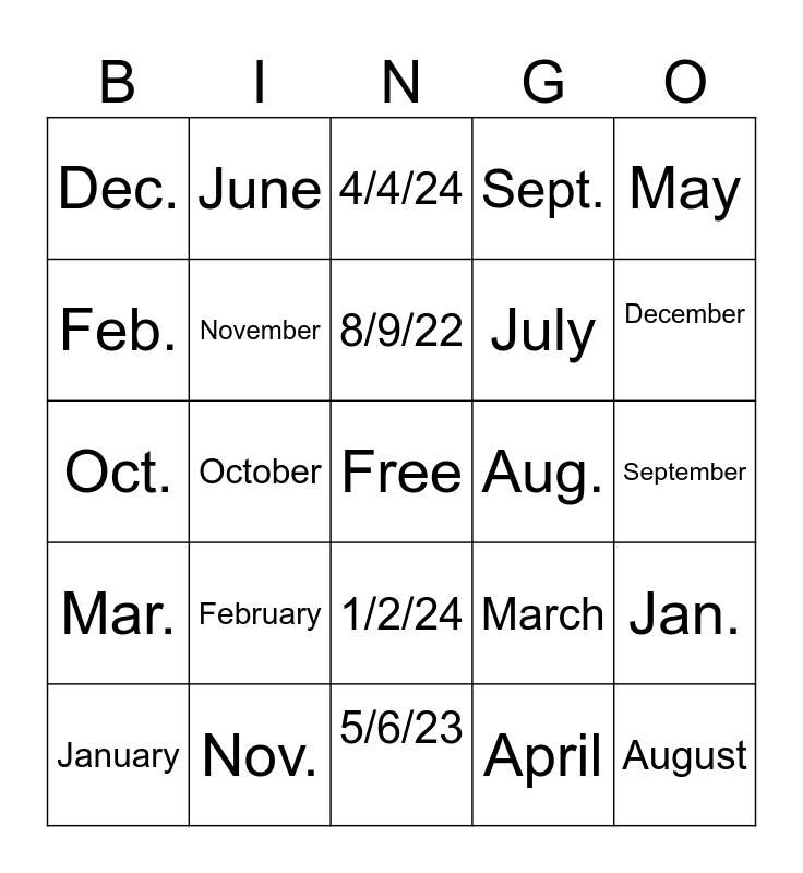 This bingo card has a free space and 24 words: January, February, 8/9/22, April, May, Dec., June, 4/4/24, Aug., September, Oct., November, March, Jan., Feb., Nov., 5/6/23, Sept., December, Mar., October, 1/2/24, July and August.