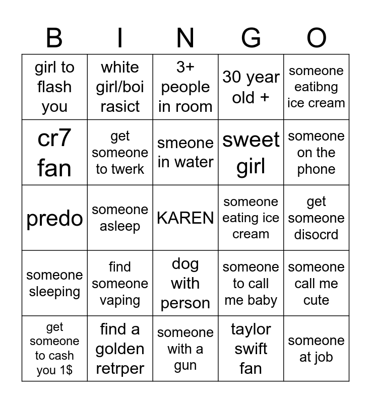 This bingo card has a free space and 24 words: find someone vaping, find a golden retrper, smeone in water, get someone to cash you 1$, someone eatibng ice cream, girl to flash you, cr7 fan, white girl/boi rasict, someone eating ice cream, dog with person, sweet girl, predo, someone to call me baby, someone call me cute, get someone to twerk, taylor swift fan, get someone disocrd, 3+ people in room, someone on the phone, someone asleep, someone at job, someone sleeping, 30 year old + and someone with a gun.