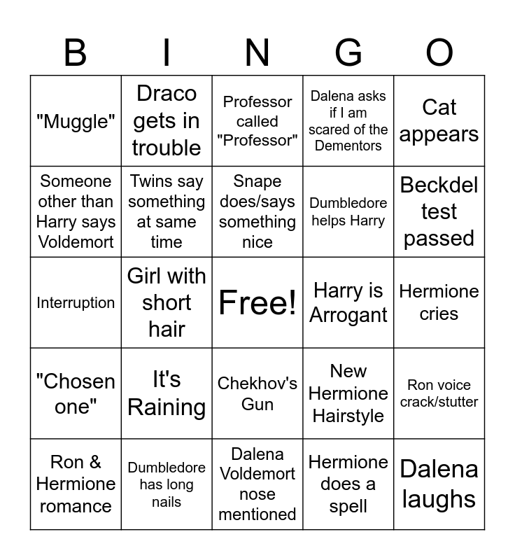 This bingo card has a free space and 24 words: It's Raining, Dumbledore has long nails, Snape does/says something nice, Ron & Hermione romance, Cat appears, "Muggle", Someone other than Harry says Voldemort, Draco gets in trouble, Harry is Arrogant, Chekhov's Gun, Dumbledore helps Harry, Interruption, New Hermione Hairstyle, Ron voice crack/stutter, Twins say something at same time, Hermione does a spell, Hermione cries, Professor called "Professor", Beckdel test passed, Girl with short hair, Dalena laughs, "Chosen one", Dalena asks if I am scared of the Dementors and Dalena Voldemort nose mentioned.