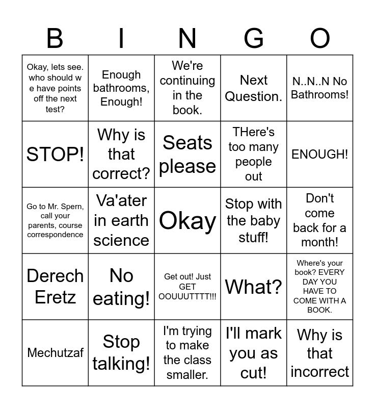 This bingo card has a free space and 24 words: No eating!, Stop talking!, Seats please, Mechutzaf, N..N..N No Bathrooms!, Okay, lets see. who should w e have points off the next test?, STOP!, Enough bathrooms, Enough!, Stop with the baby stuff!, Get out! Just GET OOUUUTTTT!!!, THere's too many people out, Go to Mr. Spern, call your parents, course correspondence, What?, Where's your book? EVERY DAY YOU HAVE TO COME WITH A BOOK., Why is that correct?, I'll mark you as cut!, Don't come back for a month!, We're continuing in the book., ENOUGH!, Va'ater in earth science, Why is that incorrect, Derech Eretz, Next Question. and I'm trying to make the class smaller..