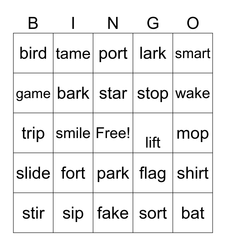 This bingo card has a free space and 24 words: fort, sip, star, stir, smart, bird, game, tame, lift, park, stop, trip, flag, shirt, bark, sort, mop, port, wake, smile, bat, slide, lark and fake.