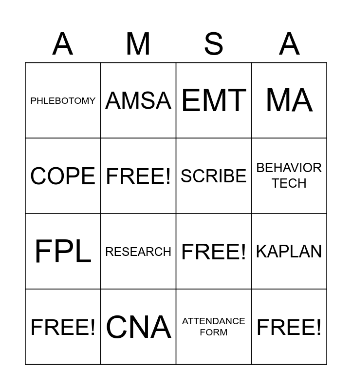 This bingo card has 16 words: FREE!, CNA, EMT, MA, COPE, AMSA, FREE!, KAPLAN, PHLEBOTOMY, FREE!, ATTENDANCE FORM, BEHAVIOR TECH, FPL, RESEARCH, SCRIBE and FREE!.
