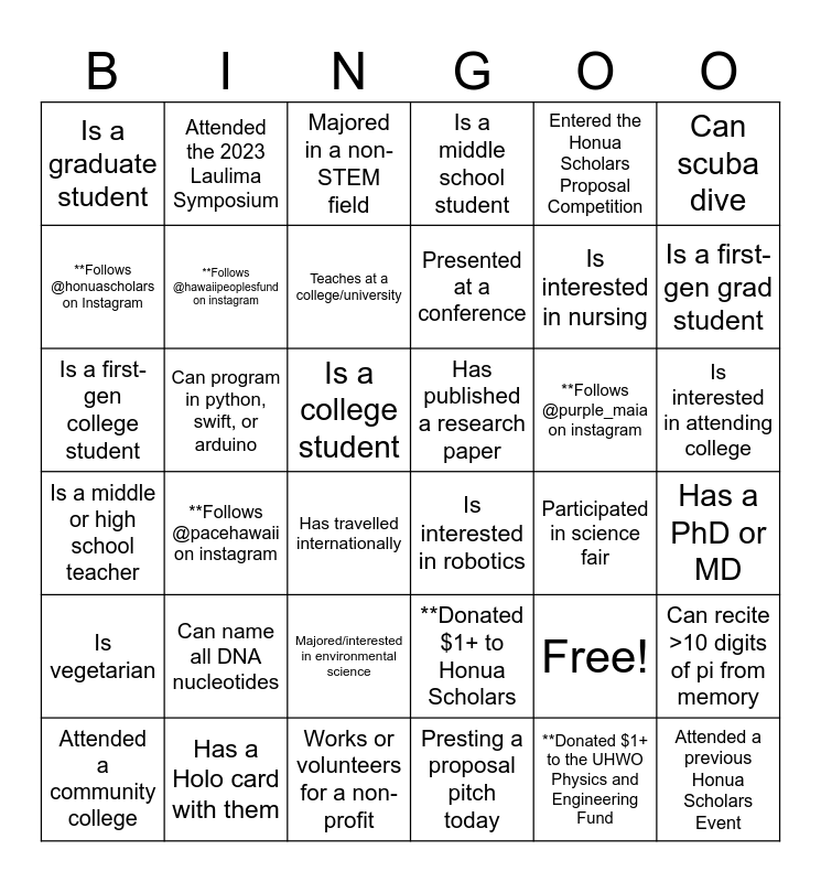This bingo card has 37 words: Free!, **Donated $1+ to Honua Scholars, **Donated $1+ to the UHWO Physics and Engineering Fund, **Follows @honuascholars on Instagram, **Follows @pacehawaii on instagram, **Follows @purple_maia on instagram, **Follows @hawaiipeoplesfund on instagram, Presting a proposal pitch today, Entered the Honua Scholars Proposal Competition, Attended a community college, Is a first-gen grad student, Is a middle school student, Is a first-gen college student, Is a college student, Can scuba dive, Has published a research paper, Can name all DNA nucleotides, Majored in a non-STEM field, Is interested in attending college, Can program in python, swift, or arduino, Is a graduate student, Presented at a conference, Has travelled internationally, Participated in science fair, Has a Holo card with them, Has a PhD or MD, Attended the 2023 Laulima Symposium, Works or volunteers for a non-profit, Can recite >10 digits of pi from memory, Majored/interested in environmental science, Is a teacher or works in education, Is interested in robotics, Is interested in nursing, Is vegetarian, Is a middle or high school teacher, Teaches at a college/university and Attended a previous Honua Scholars Event.