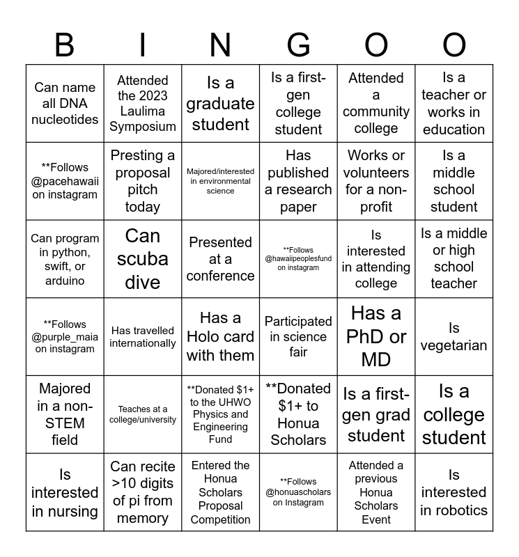 This bingo card has 36 words: **Donated $1+ to Honua Scholars, **Donated $1+ to the UHWO Physics and Engineering Fund, **Follows @honuascholars on Instagram, **Follows @pacehawaii on instagram, **Follows @purple_maia on instagram, **Follows @hawaiipeoplesfund on instagram, Presting a proposal pitch today, Entered the Honua Scholars Proposal Competition, Attended a community college, Is a first-gen grad student, Is a middle school student, Is a first-gen college student, Is a college student, Can scuba dive, Has published a research paper, Can name all DNA nucleotides, Majored in a non-STEM field, Is interested in attending college, Can program in python, swift, or arduino, Is a graduate student, Presented at a conference, Has travelled internationally, Participated in science fair, Has a Holo card with them, Has a PhD or MD, Attended the 2023 Laulima Symposium, Works or volunteers for a non-profit, Can recite >10 digits of pi from memory, Majored/interested in environmental science, Is a teacher or works in education, Is interested in robotics, Is interested in nursing, Is vegetarian, Is a middle or high school teacher, Teaches at a college/university and Attended a previous Honua Scholars Event.