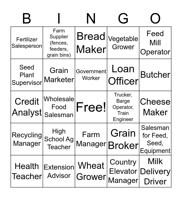 This bingo card has a free space and 24 words: High School Ag Teacher, Extension Advisor, Government Worker, Health Teacher, Feed Mill Operator, Fertilizer Salesperson, Seed Plant Supervisor, Farm Supplier (fences, feeders, grain bins), Trucker, Barge Operator, Train Engineer, Farm Manager, Loan Officer, Credit Analyst, Grain Broker, Salesman for Feed, Seed, Equipment, Grain Marketer, Country Elevator Manager, Cheese Maker, Bread Maker, Butcher, Wholesale Food Salesman, Milk Delivery Driver, Recycling Manager, Vegetable Grower and Wheat Grower.