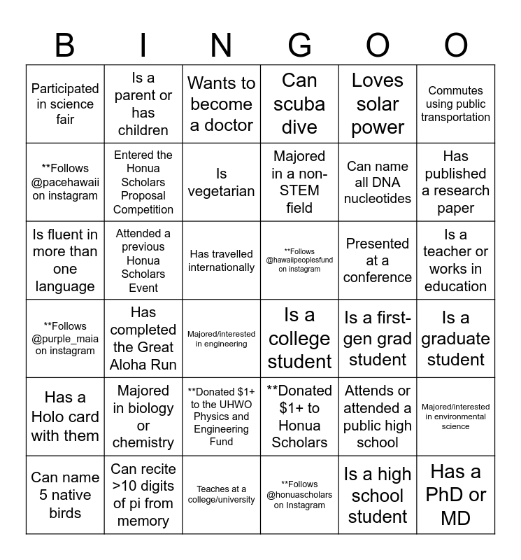 This bingo card has 36 words: **Donated $1+ to Honua Scholars, **Donated $1+ to the UHWO Physics and Engineering Fund, **Follows @honuascholars on Instagram, **Follows @pacehawaii on instagram, **Follows @purple_maia on instagram, **Follows @hawaiipeoplesfund on instagram, Entered the Honua Scholars Proposal Competition, Teaches at a college/university, Loves solar power, Attends or attended a public high school, Has published a research paper, Can scuba dive, Majored/interested in environmental science, Attended a previous Honua Scholars Event, Majored in a non-STEM field, Participated in science fair, Has a Holo card with them, Presented at a conference, Is fluent in more than one language, Wants to become a doctor, Has travelled internationally, Has completed the Great Aloha Run, Is a college student, Majored/interested in engineering, Is a first-gen grad student, Is a parent or has children, Can name all DNA nucleotides, Can recite >10 digits of pi from memory, Is vegetarian, Commutes using public transportation, Has a PhD or MD, Can name 5 native birds, Is a graduate student, Is a teacher or works in education, Majored in biology or chemistry and Is a high school student.