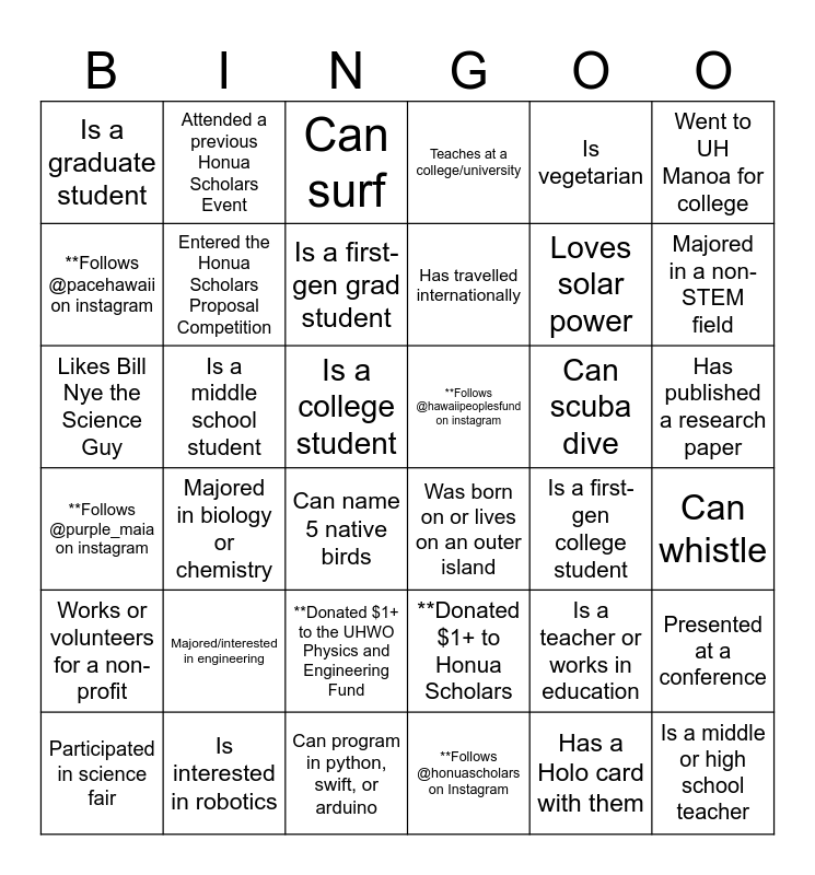 This bingo card has 36 words: **Donated $1+ to Honua Scholars, **Donated $1+ to the UHWO Physics and Engineering Fund, **Follows @honuascholars on Instagram, **Follows @pacehawaii on instagram, **Follows @purple_maia on instagram, **Follows @hawaiipeoplesfund on instagram, Entered the Honua Scholars Proposal Competition, Can program in python, swift, or arduino, Is vegetarian, Is a teacher or works in education, Majored in a non-STEM field, Teaches at a college/university, Presented at a conference, Is a middle school student, Has travelled internationally, Is a graduate student, Works or volunteers for a non-profit, Can scuba dive, Likes Bill Nye the Science Guy, Can surf, Is a college student, Majored in biology or chemistry, Was born on or lives on an outer island, Can name 5 native birds, Is a first-gen college student, Attended a previous Honua Scholars Event, Loves solar power, Is interested in robotics, Is a first-gen grad student, Went to UH Manoa for college, Is a middle or high school teacher, Participated in science fair, Can whistle, Has published a research paper, Majored/interested in engineering and Has a Holo card with them.