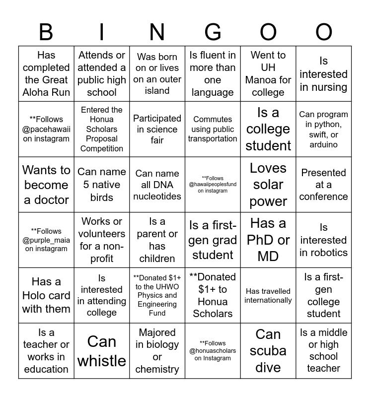 This bingo card has 36 words: **Donated $1+ to Honua Scholars, **Donated $1+ to the UHWO Physics and Engineering Fund, **Follows @honuascholars on Instagram, **Follows @pacehawaii on instagram, **Follows @purple_maia on instagram, **Follows @hawaiipeoplesfund on instagram, Entered the Honua Scholars Proposal Competition, Majored in biology or chemistry, Went to UH Manoa for college, Has travelled internationally, Can program in python, swift, or arduino, Is fluent in more than one language, Is a first-gen college student, Can name 5 native birds, Commutes using public transportation, Has completed the Great Aloha Run, Has a Holo card with them, Loves solar power, Wants to become a doctor, Was born on or lives on an outer island, Can name all DNA nucleotides, Works or volunteers for a non-profit, Is a first-gen grad student, Is a parent or has children, Has a PhD or MD, Attends or attended a public high school, Is a college student, Can whistle, Participated in science fair, Is interested in nursing, Is a middle or high school teacher, Is a teacher or works in education, Is interested in robotics, Presented at a conference, Is interested in attending college and Can scuba dive.