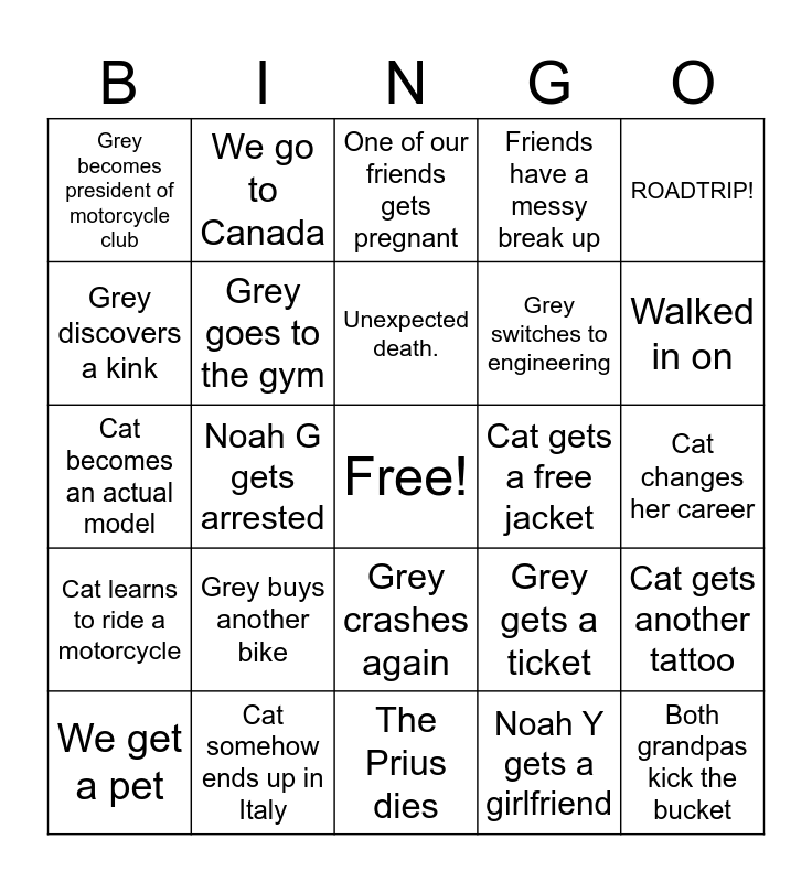 This bingo card has a free space and 24 words: We get a pet, Grey buys another bike, Unexpected death., Noah Y gets a girlfriend, ROADTRIP!, Grey becomes president of motorcycle club, We go to Canada, One of our friends gets pregnant, Cat gets a free jacket, Cat changes her career, Cat becomes an actual model, Grey goes to the gym, Grey gets a ticket, Cat gets another tattoo, Grey discovers a kink, Cat somehow ends up in Italy, The Prius dies, Friends have a messy break up, Walked in on, Cat learns to ride a motorcycle, Noah G gets arrested, Grey crashes again, Grey switches to engineering and Both grandpas kick the bucket.