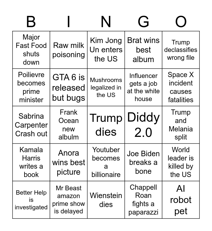 This bingo card has 25 words: Anora wins best picture, Wienstein dies, Mushrooms legalized in the US, Better Help is investigated, Trump declassifies wrong file, Major Fast Food shuts down, Poilievre becomes prime minister, Raw milk poisoning, Diddy 2.0, Youtuber becomes a billionaire, Influencer gets a job at the white house, Sabrina Carpenter Crash out, Joe Biden breaks a bone, World leader is killed by the US, GTA 6 is released but bugs, AI robot pet, Trump and Melania split, Kim Jong Un enters the US, Space X incident causes fatalities, Frank Ocean new albulm, Trump dies, Mr Beast amazon prime show is delayed, Kamala Harris writes a book, Brat wins best album and Chappell Roan fights a paparazzi.