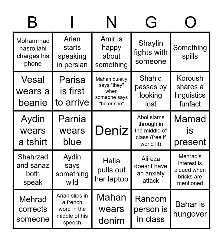 This bingo card has a free space and 24 words: Aydin says something wild, Arian slips in a french word in the middle of his speech, Mahan quietly says "they" when someone says "he or she", Mehrad corrects someone, Something spills, Mohammad nasrollahi charges his phone, Vesal wears a beanie, Arian starts speaking in persian, Abol slams through in the middle of class (free if world lit), Helia pulls out her laptop, Shahid passes by looking lost, Aydin wears a tshirt, Alireza doesnt have an anxiety attack, Mehrad's interest is piqued when bricks are mentioned, Parisa is first to arrive, Random person is in class, Mamad is present, Amir is happy about something, Koroush shares a linguistics funfact, Parnia wears blue, Bahar is hungover, Shahrzad and sanaz both speak, Shaylin fights with someone and Mahan wears denim.