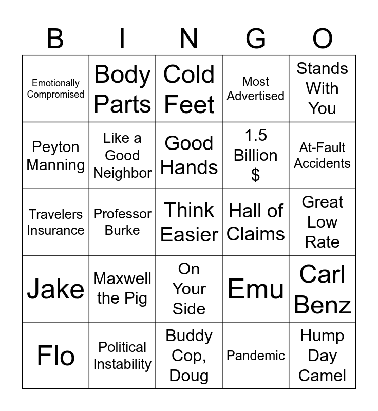 This bingo card has 39 words: Caveman Can Do It, Gecko, Mayhem, Like a Good Neighbor, Flo, On Your Side, Good Hands, 15 minutes, Stands With You, Jake, Professor Burke, Most Advertised, Think Easier, Great Low Rate, Hall of Claims, Maxwell the Pig, We know a thing or two, Emotionally Compromised, Hot Tub, Emu, Peyton Manning, Buddy Cop, Doug, 1.5 Billion $, At-Fault Accidents, Air Insurance, Maserati, Hump Day Camel, Falling Coconuts, Alien Abduction, Body Parts, Ghost Damage, Taste Buds, Cold Feet, Political Instability, Pandemic, Yellow, Carl Benz, Travelers Insurance and Florida.