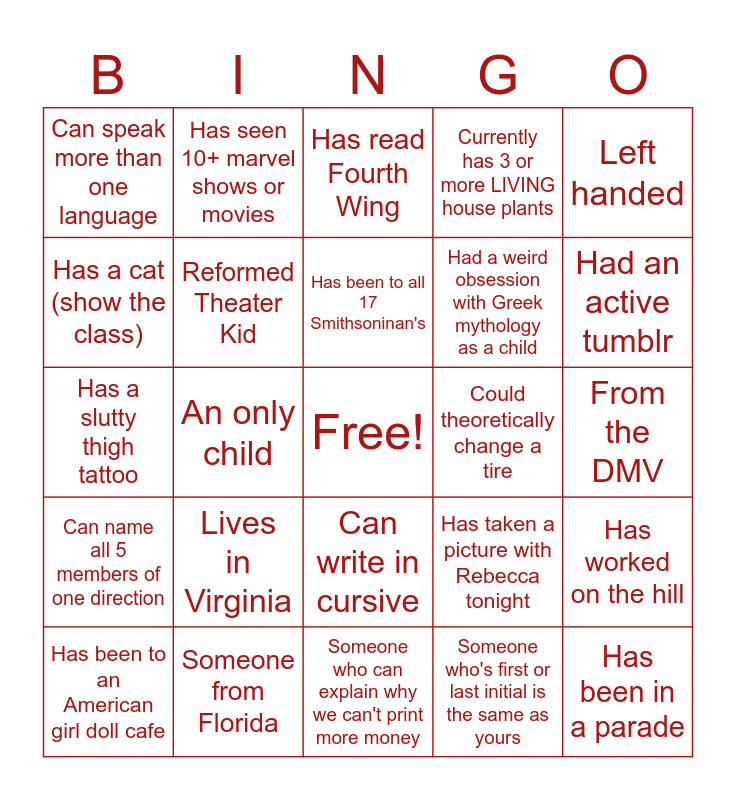 This bingo card has a free space and 30 words: Someone from Florida, Another Scorpio, An only child, Someone you have a mutual connection with on LinkedIn, Can speak more than one language, Has read Fourth Wing, Reformed Theater Kid, Can write in cursive, Could theoretically change a tire, Someone who can explain why we can't print more money, From the DMV, Has been in a parade, Someone who's first or last initial is the same as yours, Dressed up for Halloween, Had an active tumblr, Has been to at least 3 concerts this year, Has taken a picture with Rebecca tonight, Can name all 5 members of one direction, Lives in Virginia, Left handed, Has a slutty thigh tattoo, Has a thick neck, Has seen 10+ marvel shows or movies, Had a weird obsession with Greek mythology as a child, Has a cat (show the class), Currently has 3 or more LIVING house plants, Has worked on the hill, Has been to an American girl doll cafe, Has been to all 17 Smithsoninan's and Visited over 7 national parks.