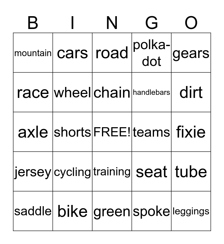 This bingo card has a free space and 24 words: cycling, bike, chain, saddle, gears, mountain, race, cars, teams, training, handlebars, axle, seat, tube, wheel, spoke, fixie, road, dirt, shorts, leggings, jersey, polka-dot and green.
