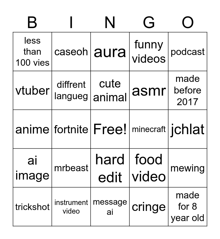 This bingo card has a free space and 24 words: mrbeast, instrument video, cute animal, trickshot, podcast, less than 100 vies, vtuber, caseoh, minecraft, hard edit, asmr, anime, food video, mewing, diffrent langueg, cringe, jchlat, aura, made before 2017, fortnite, made for 8 year old, ai image, funny videos and message ai.